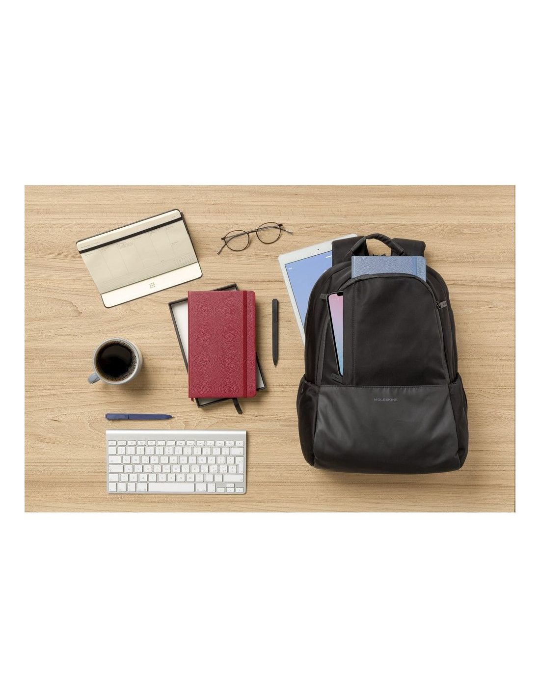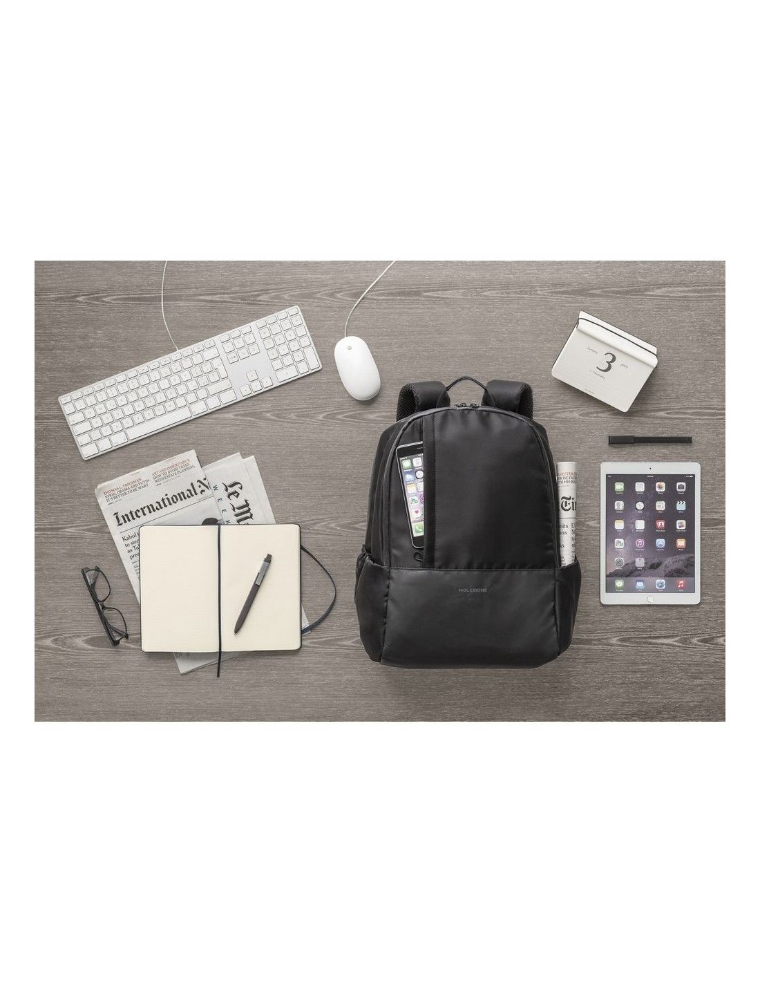 Plecak na laptopa 15" MOLESKINE Business, przegroda główna oraz 2 kieszenie przednie na zamek błyskawiczny, średnia kieszeń z licznymi przegródkami, przegroda główna z miękką przegrodą na laptopa oraz na tablet i miejscami na przybory do pisania, pasek do zamocowania na torbie podróżnej, kieszeń na zamek błyskawiczny na plecach, miękkie plecy i paski na ramię, 2 kieszenie boczne